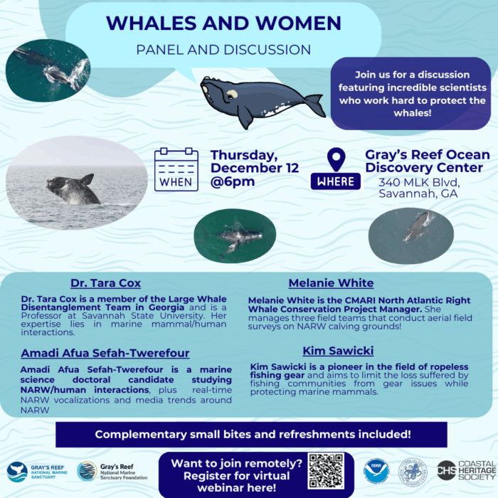 On December 12th 2024 we hosted the Women and Whales panel, as part of Georgia Whale Week at the Ocean Discovery Center. We were honored to have a panel of impressive scientists who have dedicated their careers to saving the whales! A well-loved tradition of Georgia Whale Week, this panel featured Dr. Tara Cox of Savannah State University, Kim Sawicki of Sustainable Seas Technology, Cheryl Munday of Low Country Marine Mammal Network and founder of the Right Whale Festival, and Amadi Afua Sefar-Twerefour of SEOE, USC, and Woods Hole Oceanographic Institute. It truly was an event full of inspiring women and open discussion centered around the endangered North Atlantic Right Whale and us!
